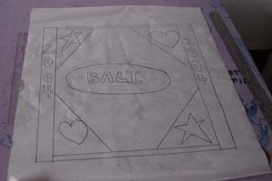 Next, the teacher stretched a piece of ordinary white cotton sheeting over a homemade light box made of cardboard, scrap wood, and a light bulb. The paper-based design was placed directly underneath the cotton sheet, so the girls could easily trace it with pencil.