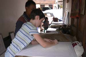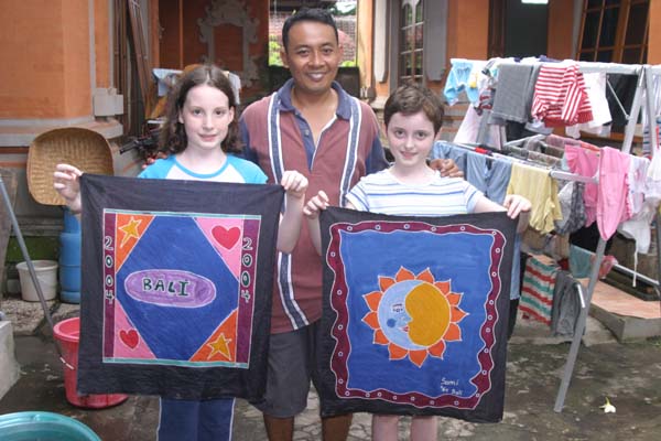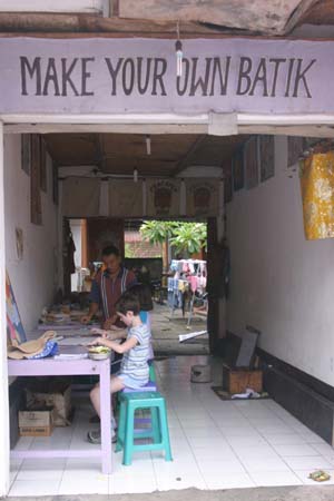 The girls were, however, less than excited about our plans. They were quite happy with an endless stretch of days that involved nothing more strenuous than deciding which of the hotel’s three pools to plunge into first, second, and third. They viewed our attempts to inject some interactive, inter-cultural activity as counter to the whole point of a relaxed family vacation. When we told them that the next day we would take an hour-long car ride to Ubud to find something to do that did not involve a pool, a deck of cards, or a book, there was much protesting. The next morning in Ubud, we walked up and down the small town’s main streets for over an hour, searching out interesting places for hands-on stuff. The girls trailed behind. It must be said that there was whining involved – about the walking, the heat, their parents’ weird ideas of fun, etc. We first checked out the art museum, which we had been told had excellent hands-on cultural classes. True - but the girls adamantly refused to declare enthusiasm for any of them. “It sounds boring!” “FOUR HOURS to make temple offerings? That’s WAY too long – I don’t wanna!” “Mask-making? Count me out!” Sighing, we headed for another highly-recommended place, a small community center-cum-lending library. The friendly director had a lot of great-sounded ideas for the girls. When we turned around to ask them whether they’d like to try a Balinese dance lesson, they’d vanished – up the stairs to the library, where we found them both nose-deep in books! Nothing against reading, but not exactly the kind of cultural experience we had in mind. So you can imagine our surprise when, a little while later, as we were walking down winding, hilly Monkey Forest Road, they both exclaimed, "Ooo! That looks like fun!" We grown-ups did a double-take and quickly back-tracked to a tiny street-side workshop offering make-your-own batik.