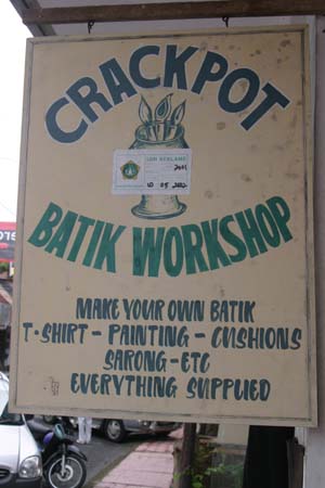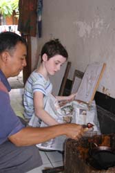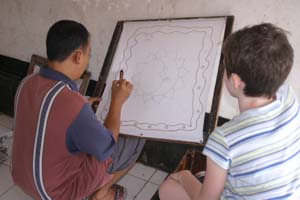 Scattered around his shop were patterns for extremely intricate designs that would have taken hours just to trace; now, seeing the delicacy of the hot-wax process and realizing what a long and tricky task it would be to outline one of these complex patterns, let alone paint in each tiny section, the reasons that batik is so expensive (relatively speaking) became much clearer! After a fair bit of experimentation by both girls on the scrap piece as well as their own designs, the teacher helped things along, finishing up the hot wax process for them. He made it look simple - but now we knew better.