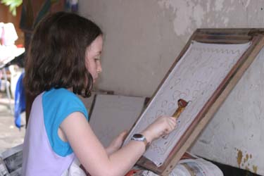 Once the design was on the sheet, the girls proceeded to the next step -- applying molten beeswax to each traced line. The teacher was well aware of the potential for dangerous burns, and he was careful to show each girl how to hold the special tool for applying the hot wax. It looked very tricky, and fortunately the teacher encouraged them to practice on a scrap of cloth.