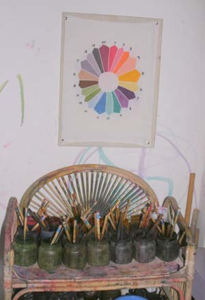 Promptly at five, we headed back up the hill to the workshop. The girls’ batiks had come through the boiling process successfully; the wax outlines had melted away and the colors had deepened into jewel-like tones. We were amazed at the transformation, and the girls were proud of their work, enthusiastically thanking their teacher and then posing in his courtyard alongside the drying laundry.