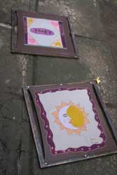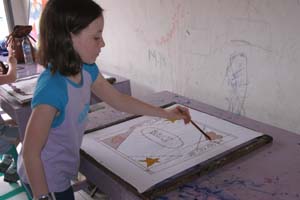 The kids didn’t notice any of the goings-on around them, focusing quickly and intently on their projects. The first step was deciding what to paint. After rummaging through a huge pile of patterns, Sami decided to trace a sun-and-moon template, while Miranda forged ahead with her own unique design commemorating our visit.