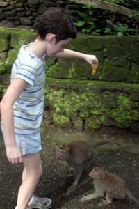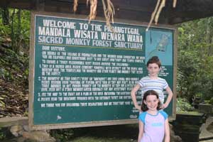 A stroll through Bali’s famous Monkey Forest took just enough time for the girls’ batiks to dry. This part of Bali contains a number of famous temples sited within ancient, untouched forests that are home to large bands of wild monkeys. Lucky monkeys; their choice of real estate endows them with holy status thanks to the nearby temples. Sharon and I had visited the forest during our last trip to Bali 17 years ago, and I was curious to see whether it had changed. Back then, the town of Ubud was a fair distance from the forest entrance, requiring an hour’s walk. But the town had grown so much since then that the streets, shops and restaurants now extended all the way to the official entrance to the park. Instead of an adventurous trek to the forest, like we had experienced back then, going from the town to the forest entrance felt just like crossing Fifth Avenue to enter Central Park!