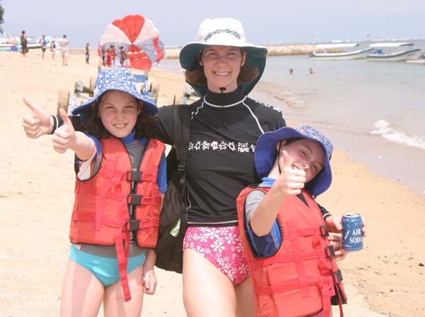 When we first visited Bali in 1987, we hitched ourselves to a parachute and a powerboat for a parasail ride high above Bali. We loved it and were looking forward to another turn. Would the girls be bold enough to try it? Yes, no, maybe, yes, oh, wait, no, okay, fine, if YOU do it, I will, too…. Sharon showed the way, suiting up on Sanur Beach while Sami and Miranda watched apprehensively.