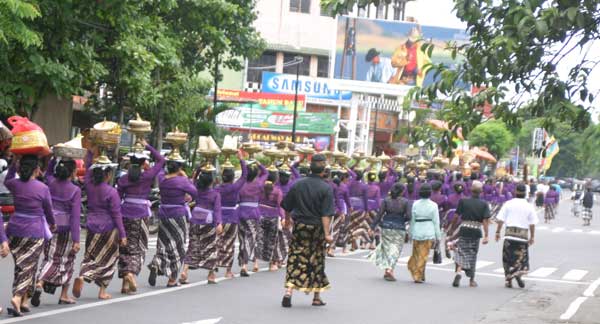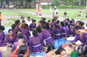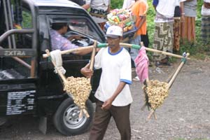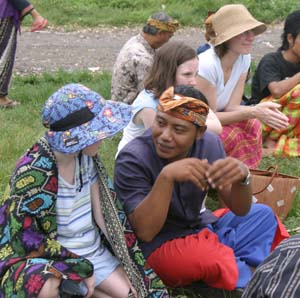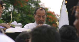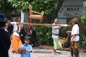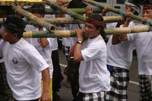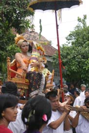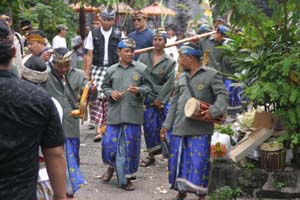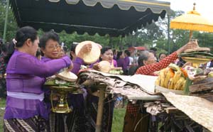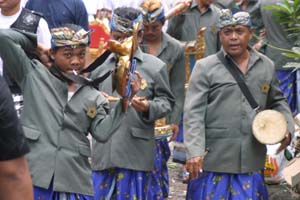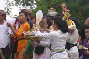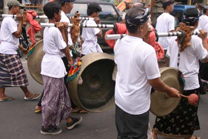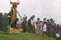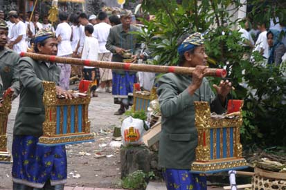 Clanging, repetitive, hypnotic music from two separate gamelan orchestras added to the surreal scene. The temperature was in the high 90s and the humidity was just about 100%, so the bull-bearers had a hard job.