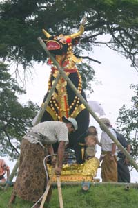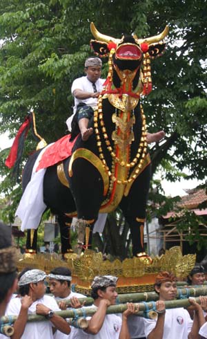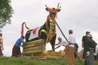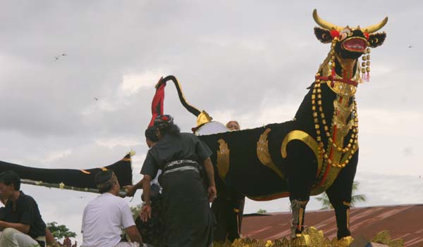 | I know it's kind of odd to go to a funeral while on vacation – especially when the deceased is someone you’ve never met! But in Bali, cremations are the occasion for enormous festivities to honor not only the individual, but also the clan and caste. We had asked the hotel staff if any funerals would be taking place during our stay, and about a week later, they arranged a car and guide for us to attend an unusually elaborate ceremony honoring a woman of the Brahmin, or priestly caste – the highest of Bali’s four castes. The castes are slowly losing their full meaning, but traces of them are still very much evident in daily life, in people's names, in the speech they use to address each other, and, most visibly, in the size and scope of their funeral arrangements. This woman, aged 74, had died four days’ previously, and her family had selected this extremely auspicious day for her rites. (The next “good” day for a funeral was some weeks hence.) As you’ll see, cremations are elaborate affairs. Often Balinese families bury their dead and then wait months or even years to hold the formal cremation, saving up enough money to give the dead a big send-off (and, yes, for the morbidly curious, they dig the body up in order to cremate it). The two largest expenses were parked right outside the family temple as we pulled up with our guide: an enormous, bull-shaped casket: