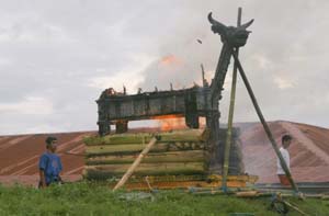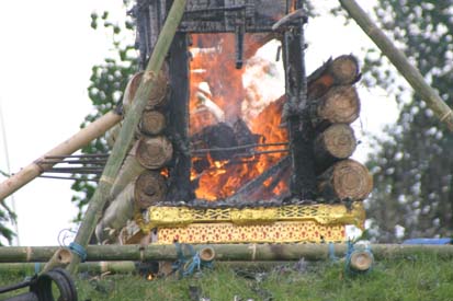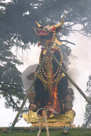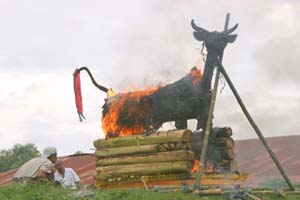 With the blessings concluded, a pyre of green palm wood was swiftly built at the base of the bull (note the propane pipe threaded between the front legs).