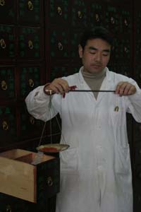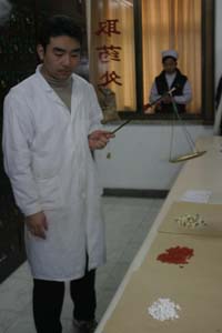 What was interesting is that the result of this treatment matched what the pulse-diagnostician had said -- I was "hot" on my left side. I still don't know what that really means, but it's quite interesting that even though all of the cups were lit and positioned in the same way, the resulting red spots were quite different! Of course, at the time (having not seen these pictures), I didn't realize what my back looked ike. But I felt great -- as if I had woken up from a long nap after a deep massage. In fact, I had only dozed lightly for about 10 minutes, and no one had given me a rubdown. After I got dressed, we decided to skip the acupuncture, both because there was a long line, and because the woman we saw undergoing the treatment was actively wincing in pain each time a needle was inserted. I thought that acupuncture was painless! As it turned out, one of the experts said that that wasn't always true. Sometimes acupuncture does hurt, depending on what is being treated, and where the needles are inserted. It didn't help to see the doctor's worktable, which was covered with pieces of blood-stained gauze. Even I have limits as to what I'll let the girls dare me to do! Instead, we scooted down the hall to the pharmacy, which was fascinating (and very fagrant, since the many drawers were packed with bark, herbs and...other stuff). There, a white-coated "pharmacist of traditional medicine" gave a talk about how traditional Chinese medicine works. The centerpiece of any Chinese pharmacy is the medicine cabient -- usually a gargantuan set of little wooden drawers. Before opening the drawers, the pharmacist writes up a perscription, which is always fine-tuned for the individual patient. It looks like a recipe, and specifies the exact types and amounts of each ingredient.