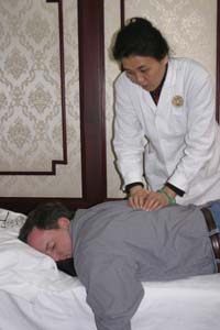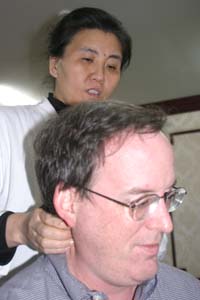 As promised, we each had the opportunity to undergo the regimens practiced at the center. The first stop was pulse-diagnosis, shown below. A practioner uses her fingers to listen carefully to your pulse, from two different locations on your left wrist. She also asks a few questions, such as your age and weight. Finally, she takes a quick glance at your tongue - using no depressor - you just stick it out! She then delivers a diagnosis, and proceeds to apply pressure on certain points that need it.