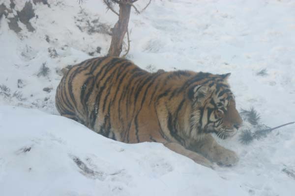 Just as the spectacle of tigers lazing around threatened to get a little ho-hum, we were dropped off at an enclosed walkway that led through the pens of younger, year-old tigers, including some rare white tigers.