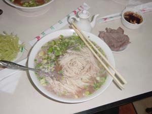 Once an order is called in, the noodle guy goes to work, yanking a wad of dough off a big log, rolling it into a ball, giving it a few kneads and then, in about 10 seconds, pulling it a dozen or so times between his hands to form a skein of thin noodles to be flung into a big pot of boiling water. Because they’re fresh, the noodles cook in just a minute or two. They’re fished out and plopped into a bowl filled with simmered stock, and topped with thin slices of radish, chopped scallions, and beef. (I often splurge and order an extra side of the sliced beef for another 2 yuan.)