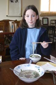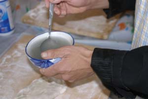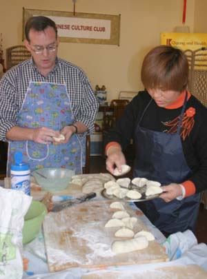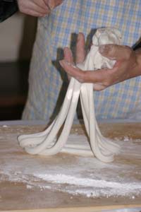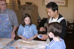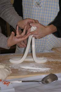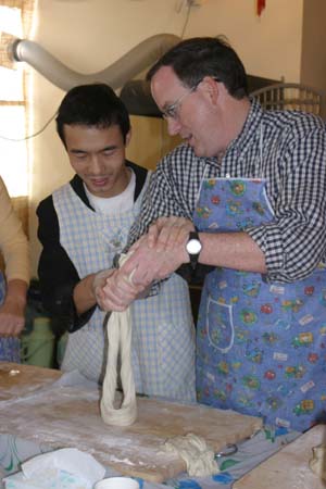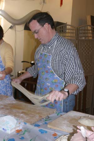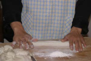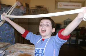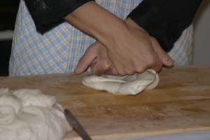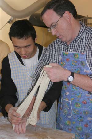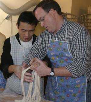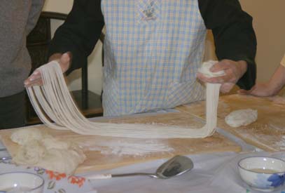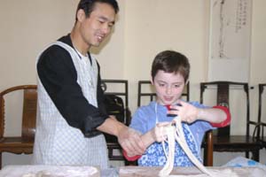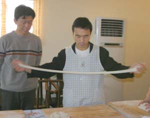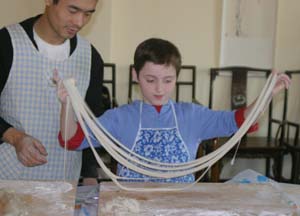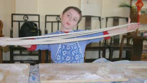 We Pull Our Own Noodles at the Chinese Culture Club Almost every week, the Chinese Culture Club, founded and run by a wonderful, knowledgeable Beijing native named Feng Cheng, offers a tour to an interesting cultural site in Beijing, and almost that often, we go along. Even better, CCC also has hands-on workshops. We’ve learned how to perform a tea ceremony, do a Yunnanese peacock dance, and tried our hands at calligraphy. When CCC offered a hand-pulled noodle-making workshop one Sunday afternoon in November 2004, we joined four other folks to learn to la those mian. Feng Cheng had invited an expert noodle chef to teach us the technique. The dough is simplicity itself; a combination of regular flour and water, plus a bit of salt. The chef brought a bag of prepared dough, so we could skip this step. He noted that the dough is more workable if it’s been made at least a few hours in advance. First step, kneading. The chef demonstrated a technique using the knuckles of crossed hands to push the dough out in two directions at once.