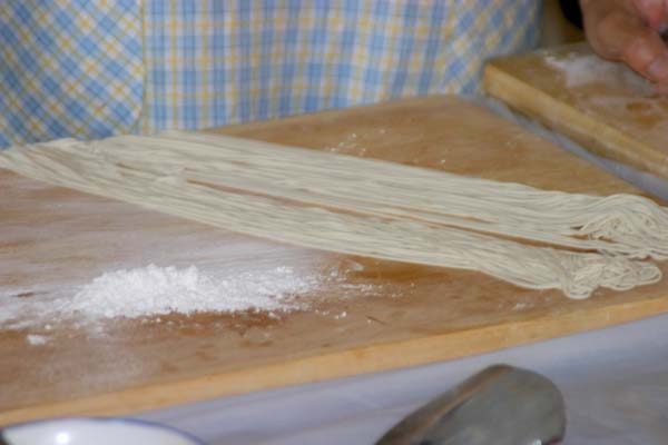 The chef pulled the dough between his hands nearly the length of his outstretched arms to produce fine, even strands.