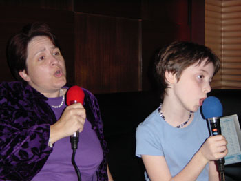After checking in, we were ushered upstairs to our private room. Party World has more than 100 such rooms, each one carefully soundproofed. As you walk down the beautifully-appointed corridors, you can faintly hear people singing behind the closed and padded doors. Every so often one of the doors opens, and you're greeted by a blast of crooning to pre-recorded music. Bustling in and out of the rooms were scores of tuxedo-clad waiters bringing drinks and clearing dishes. First stop was the dinner buffet, which is included in the room rental: unlimited food and non-alcoholic drinks. Think Las Vegas meets Chinatown and you'll get the idea. The food wasn't gourmet, but it was tasty and plentiful. After filling our plates, we hustled back to the room for some singing! Sami and I quickly commandeered the high-tech control panel, with which we created a play list of songs. The listings were voluminous -- everything from Ted Williams and Cole Porter to Britney Spears and Alanis Morrisette. The girls were especially thrilled by the selection of Broadway classics and Disney soundtracks. Without further ado, we plunged in!