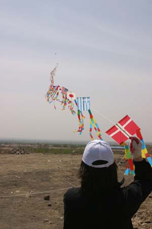 On closer inspection, that is EXACTLY what they were doing! They had made a modern-day dragon kite, where each slice of the body was a miniature national flag. What a neat idea! A flying United Nations: