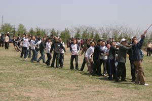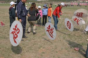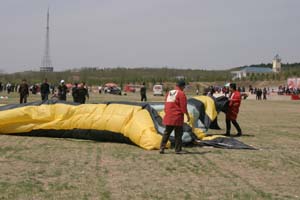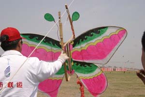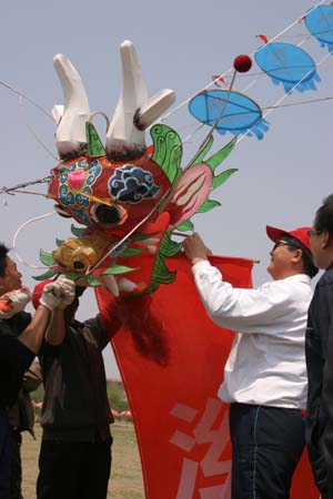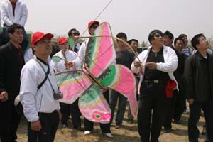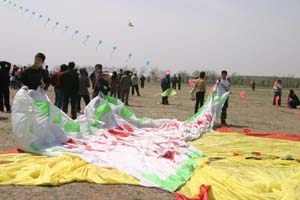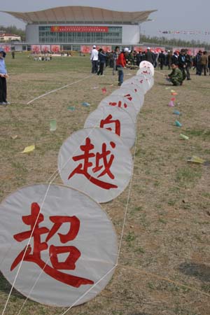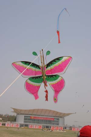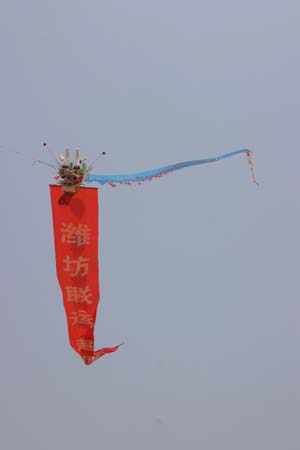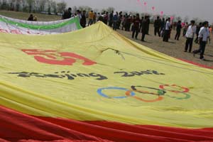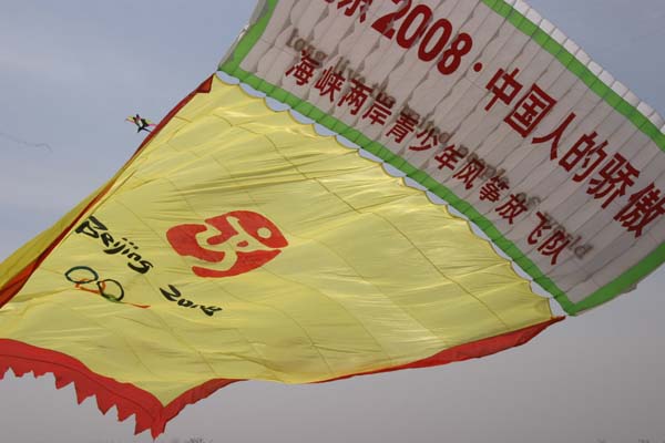 So that every nation could be represented, this kite was over 1,000 meters long. (Think a kilometer is long for a kite?!? Nah -- the longest kite we saw that day was 2.6 kilometers long. That's right -- a kite more than ONE MILE long). Sadly for the Koreans, their beautiful kite broke before it was fully deployed, and the flying string-of-nations floated down into a nearby village. We forgot to ask between which two flags the string broke -- let's hope it wasn't China and the US! Next cool kite: China is justifiably proud of being the site of the 2008 Olympics. Olympic signs are everywhere, including, of course, in Weifang. Many kites sported the Olympic logo, but this one was my favorite -- a huge, state-of-the-art parafoil.