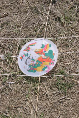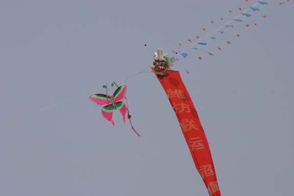 After a few seconds, the butterfly reaches the mouth of the dragon kite, just as the firecrackers finish their outburst. The dragon pretends to "eat" the butterfly, whose wings fold (courtesy of a hard tug from the ground). Then the butterfly slides back down the string, ready for another round of firecracker-assisted flight. I never got tired of watching this little dance!