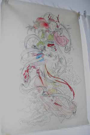 I'm embarassed to say I've forgotten their names, but I haven't forgotten their work, and their smiles! This huband and wife team are famous kite makers. She paints and colors, and he creates the frames. Together they made all of the kites on the walls. Best of all, they continued to make new kites, and were only too happy to show us how they did it. The first step was the art, which was sketched and then painted in. I asked if she worked from a book. "Of course not!" she said. "They are all from my imagination."