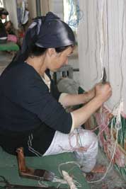 Many looms were idle due to the holiday, but several teams of women were weaving away, hands flashing with curved, ultra-sharp knives that snapped off each thread, knotting them so quickly that their fingers were a blur.