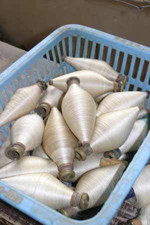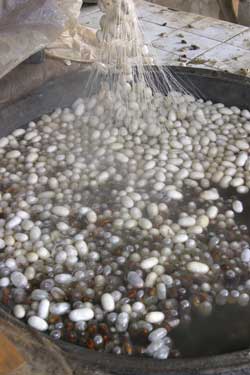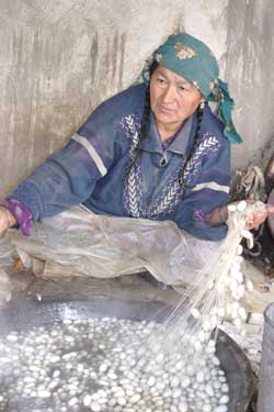A gentle whirring sound greeted us as we rounded a corner and found three women unraveling cocoons and spinning the silk into thread – by hand, using techniques first invented in China thousands of years ago.
