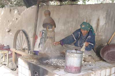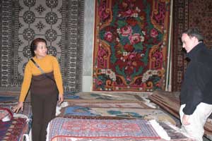 But back to jade, the third of Khotan’s three treasures. As Westerners, we freely admit that we have little knowledge and zero appreciation for this stone, which is not terribly rare but to which the Chinese ascribe all manner of virtuous, medicinal and mystical qualities. Many Chinese people wear jade bracelets or a little jade pendant on a string around their necks, put there when they are children and worn until death; these are believed to give protection against germs, evil spirits, and who knows, maybe even counterrevolutionary impulses. We, on the other hand, just enjoyed watching the process of carving the stuff. Listening, however, is not enjoyable – over a dozen whining drills in one room was incredibly noisy! Not a place to visit if you have dental aversion.