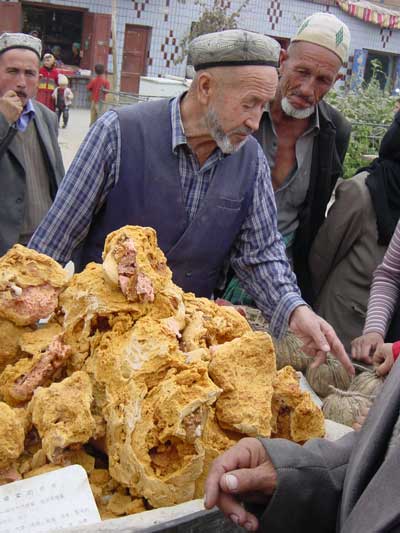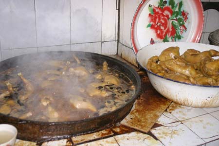 One day, seeing how desperate we were to find alternatives to mutton and fangbian mian, Gul took us to a private home where we bought a roast chicken from a family whose “secret recipe” had made them famous. We watched the plucking, and then picked our own from a fragrant-smelling pot: