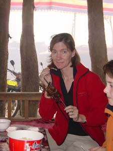 We grownups took our chances on the hotel breakfasts, which were an odd mix of Chinese (stir-fried veggies, rice porridge, leaden steamed buns) and Uighur (flatbread cooked in mutton fat, super-sweet, milky tea). Tom, who is a super-adventurous eater but only after 10 AM, filled up on fried eggs. I enjoy local breakfast foods just about anywhere (except spicy foods – I had enough hot-pepper breakfasts while living in Hunan to last a lifetime) but was glad to have brought my Earl Gray teabags to accompany the man tou and other offerings. Lunch and dinner were more problematic. Mutton, mutton, a little bread, and then some more mutton make up the Xinjiang diet. It’s typically grilled on skewers: