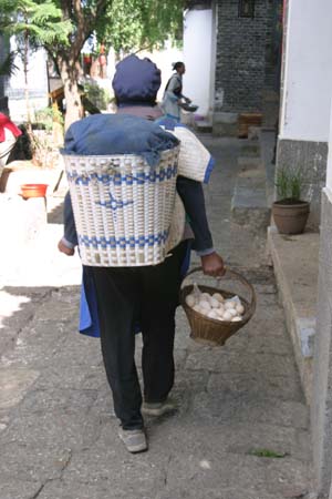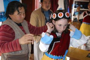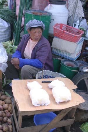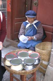 Our only purchase was a Naxi costume, found at a shop on one of the market lanes. This was the only place in town we found selling Naxi garb; the many Yunnan costume stores in Lijiang actually sell the costumes of the minorities who live further south, in Yunnan’s jungle regions bordering Thailand, Burma and Vietnam. Bursting with colorful embroidery and laden with silver ornamentation, the costumes of the Miao and Dai people are what most people think of when they mentally picture “Yunnan minority” clothes.