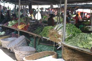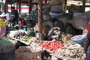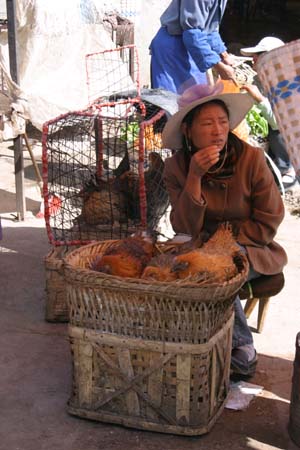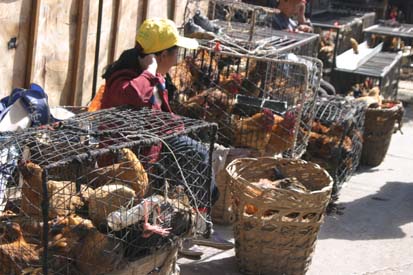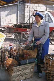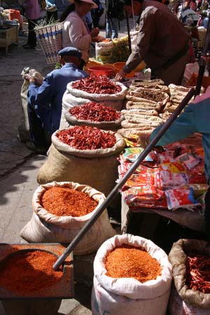 The produce looked fantastic, worthy of Whole Foods, with a local flavor – like these bales of hot peppers and chicken – sold live, of course, for maximum freshness. Next to the animals a squad of butchers stood, cleavers at the ready, to kill and dress your purchase for about RMB 1.